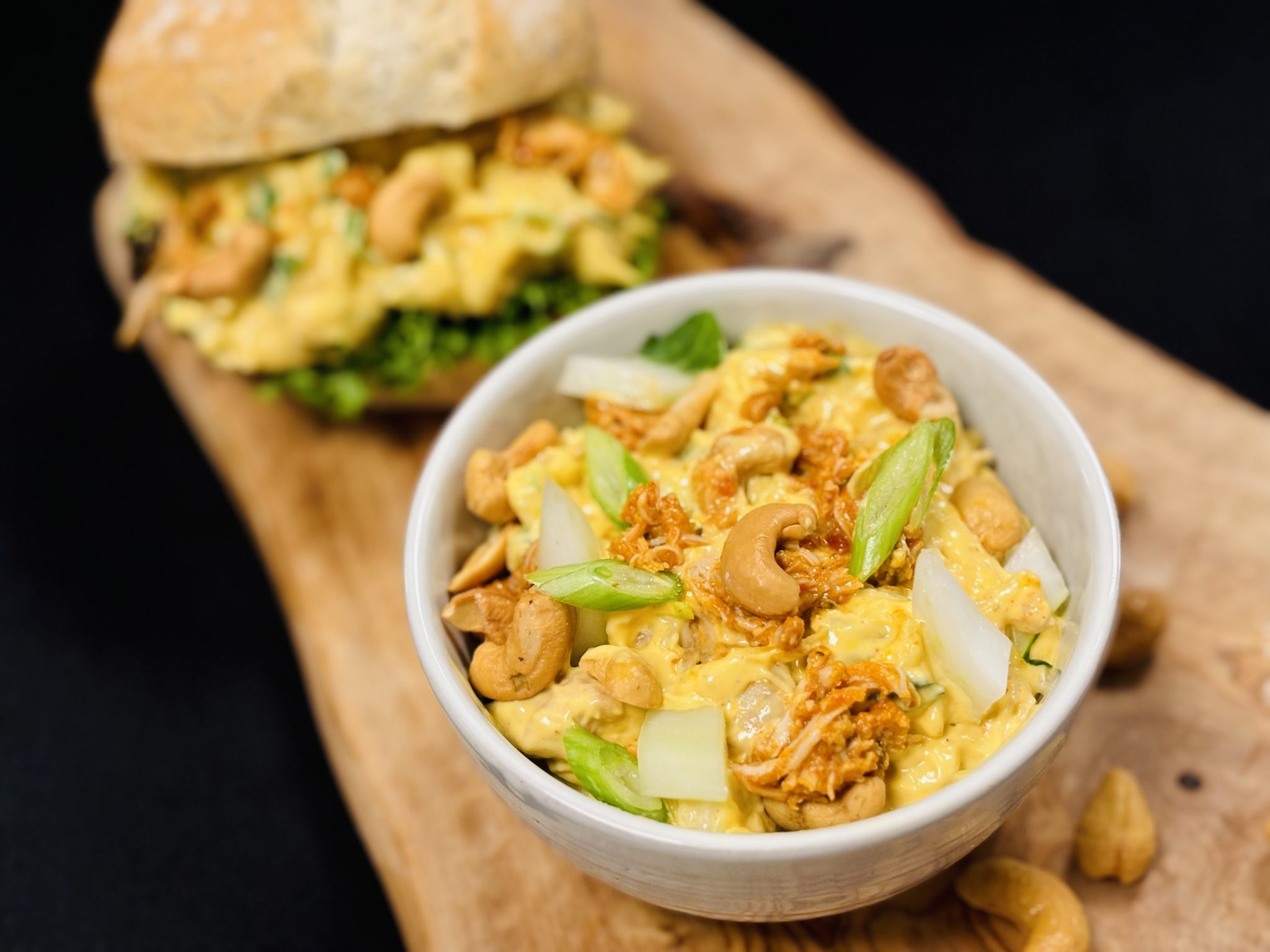 2. Garneer eventueel af met cashewnoten en fijngesneden bosui.